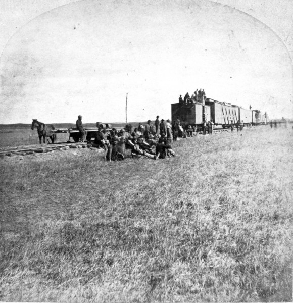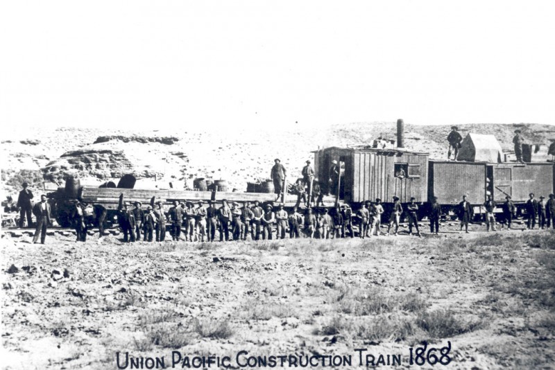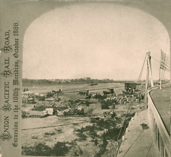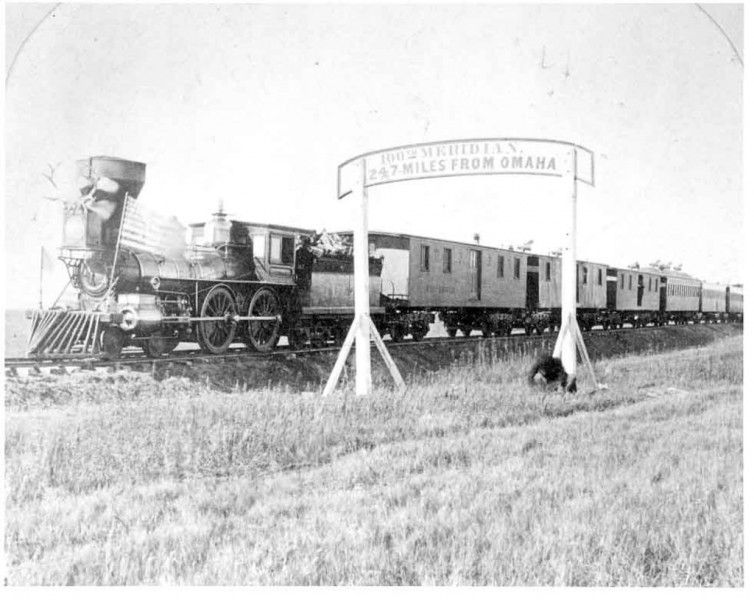 Union Pacific crews reached an important milestone when they passed the 100th meridian near Cozad, Neb. This guaranteed the railroad the irrevocable right to continue westward, as stipulated in the Pacific Railway Act of 1862. Thomas Durant hosted a "100th Meridian Excursion," organizing on the spot a group of reporters and politicians to note the event. In 1879, the U.S. Geological Survey officially established the 100th Meridian to mark 100 degrees of longitude west of Greenwich as the boundary between the "moist east and the arid west."